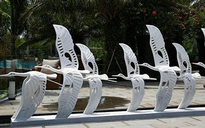 剪影雕塑,看的就是個輪廓!把你想做的東西(人、動物、樹啊啥的),簡化成影子形狀。材料選擇多:不銹鋼、耐候鋼(喜歡生銹那種質感)、玻璃鋼、鍍鋅板、鐵板都成。最后還得靠噴漆,給它們打扮上顏色。